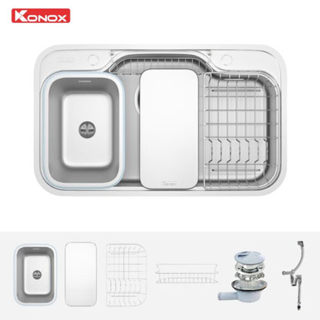 Konox Dekor 8048SU được thiết kế theo phong cách Workstation Sink với gờ hạ bậc thông minh, cho phép trượt các phụ kiện trực tiếp trên thành chậu. Nhờ đó, các thao tác rửa – sơ chế – để ráo có thể thực hiện ngay trên bồn rửa, giúp tiết kiệm diện tích mặt bếp.