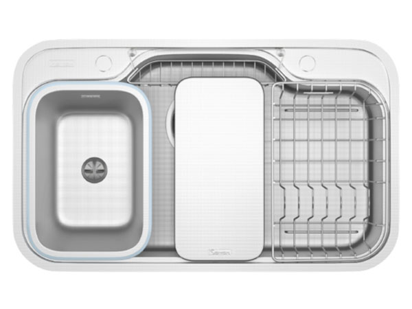 – Rổ phụ gắn thành chậu: đựng miếng rửa bát và dụng cụ vệ sinh.