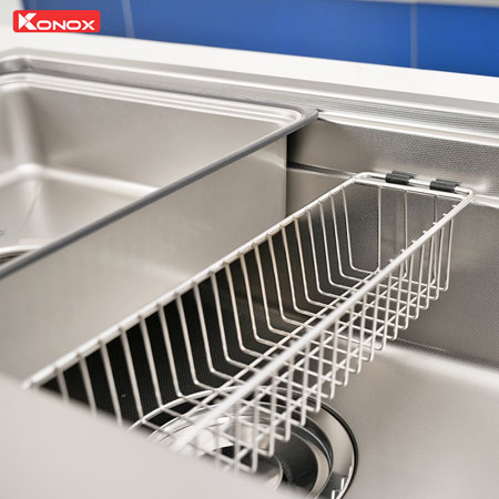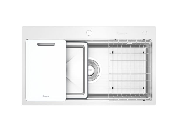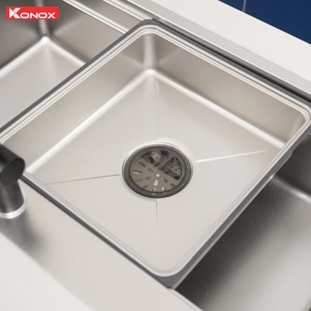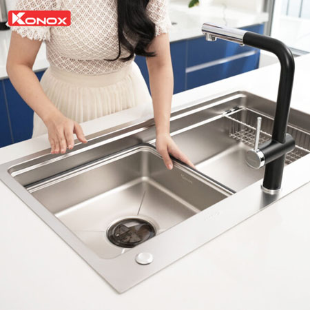 Konox KN8751TS Dekor được thiết kế theo phong cách Workstation Sink, nổi bật với 2 gờ hạ bậc thông minh cho phép trượt các phụ kiện trực tiếp trên thành chậu.